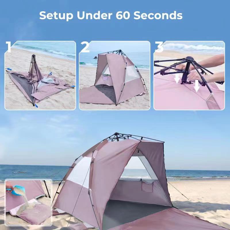 - ăHassle-free SetupăTired of setting up sun tent ? Come to setting up the tent in no time. Simply press down the top spring bracket, the auto-setup mechanism helps to situate the tent within 60 seconds. Enjoy more time with your loved ones than chores.