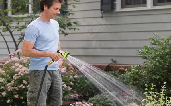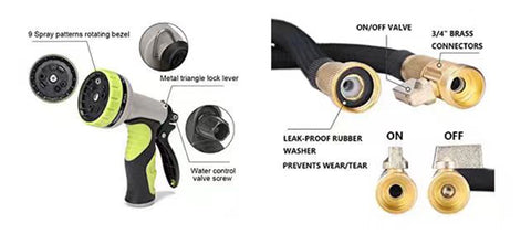 - ăWATER HOSE with 9 FUNCTIONAL NOZZLESă: Ergonomic handle for easy maneuverability. Comfortable and non-slip rubber grip. 9 patterns as you like(Flat, Shower, Cone, Mist, Full, Center, Jet, Angle and Soaker) to meet your multiple needs in daily life. Easily lock the handle for continuous spraying.