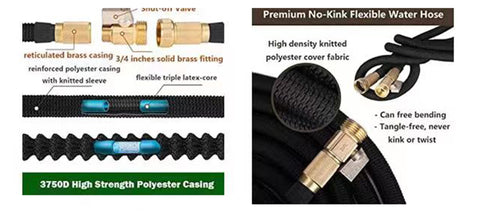 - ăHIGH-QUALITY and LIGHTWEIGHT GARDEN HOSESă: Flexible water hose, using high-density 4-layer latex core and strong 3750D polyester fiber fabric to preventing damage from normal friction of dragging on the ground. It can withstand water pressure of 3-12 Bar and temperature of 41 â-113 â. With high-quality 3 / 4-inch brass fittings and on/off valves, the expendable garden hose has excellent corrosion resistance and does not rust.